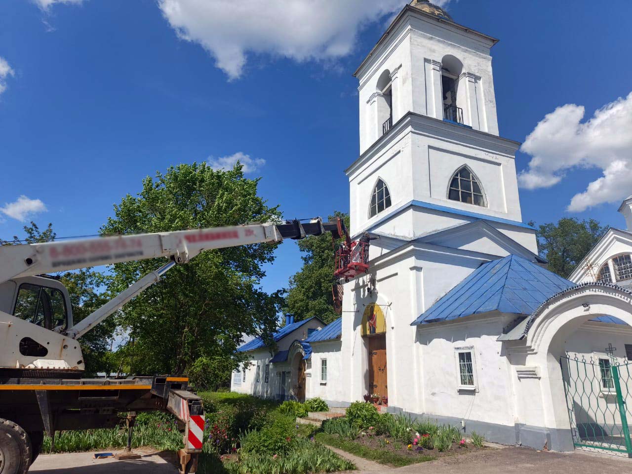А с недавнего времени начат еще один этап возрождения православной святыни – реставрация ее колокольни, которую красили более десяти лет назад. Вот уже второй день бригада строителей с помощью спецтехники проводит подготовительные работы. В ближайшее время, очистив старую поверхность стен, специалисты приступят к внешней обработке и только затем — к покраске стен колокольни.