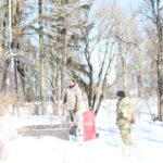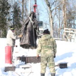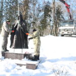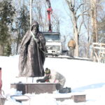 Работы по установке скульптуры проводят с помощью спецтехники (крана): сначала рабочие, которые занимаются установкой памятника, уже переместили на тросах скульптуру и приступили к ее установке на ранее оборудованном постаменте.